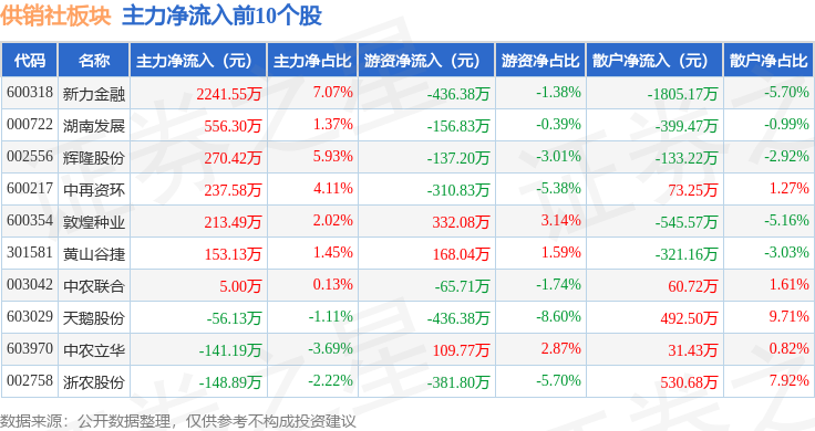 从资金流向上来看,当日供销社板块主力资金净流出2.47亿元,游资资金净流入6327.26万元,散户资金净流入1.84亿元。供销社板块个股资金流向见下表: