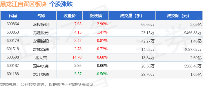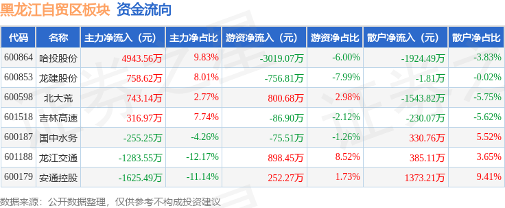 从资金流向上来看,当日黑龙江自贸区板块主力资金净流入3597.99万元,游资资金净流出1986.89万元,散户资金净流出1611.11万元。黑龙江自贸区板块个股资金流向见下表: