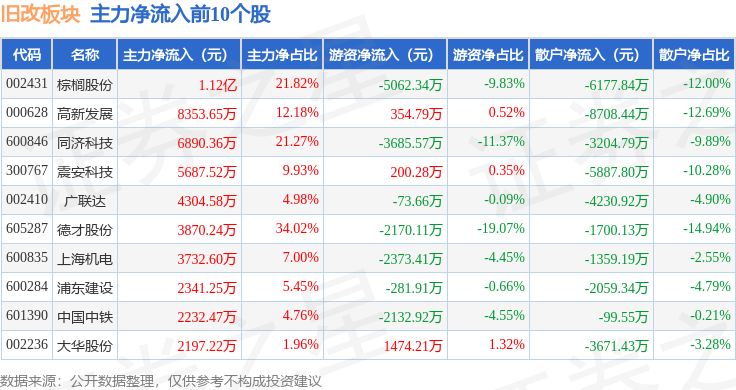 从资金流向上来看,当日旧改板块主力资金净流出8862.61万元,游资资金净流出1.35亿元,散户资金净流入2.23亿元。旧改板块个股资金流向见下表: