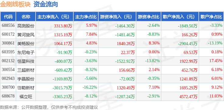 从资金流向上来看,当日金刚线板块主力资金净流出2959.14万元,游资资金净流出2408.11万元,散户资金净流入5367.25万元。金刚线板块个股资金流向见下表: