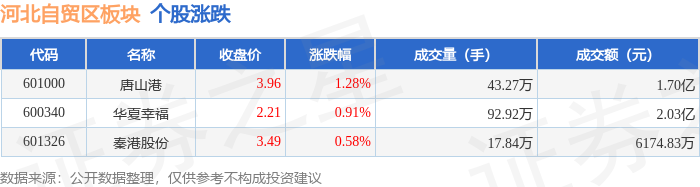 证券之星消息,9月11日河北自贸区板块较上一交易日上涨0.97%,唐山港领涨。当日上证指数报收于3875.31,上涨1.65%。深证成指报收于12979.89,上涨3.36%。河北自贸区板块个股涨跌见下表: