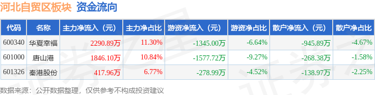 从资金流向上来看,当日河北自贸区板块主力资金净流入4554.95万元,游资资金净流出3201.71万元,散户资金净流出1353.24万元。河北自贸区板块个股资金流向见下表: