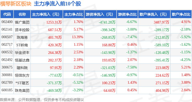 从资金流向上来看,当日横琴新区板块主力资金净流出1.89亿元,游资资金净流出3438.15万元,散户资金净流入2.23亿元。横琴新区板块个股资金流向见下表: