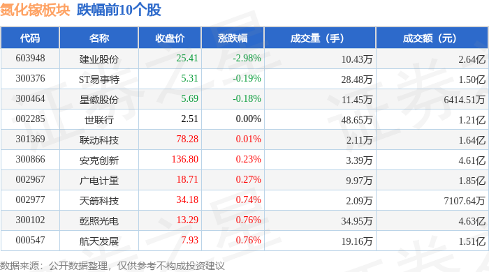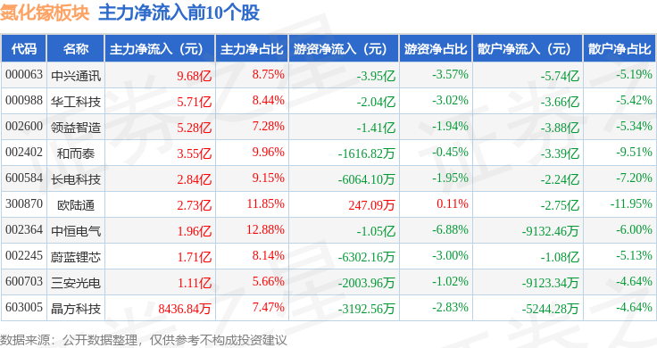 从资金流向上来看,当日氮化镓板块主力资金净流入30.85亿元,游资资金净流出13.12亿元,散户资金净流出17.73亿元。氮化镓板块个股资金流向见下表: