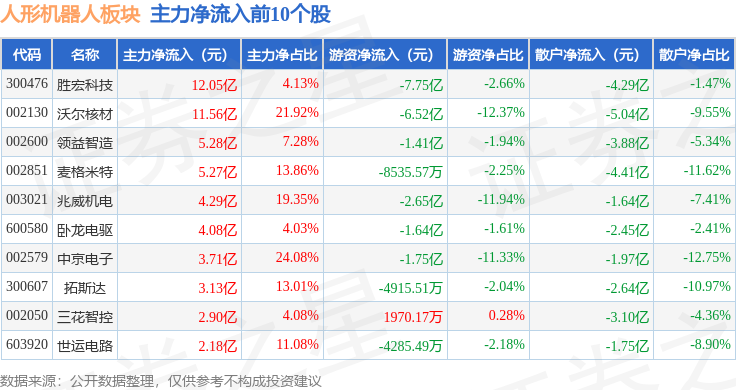 从资金流向上来看,当日人形机器人板块主力资金净流入57.21亿元,游资资金净流出41.03亿元,散户资金净流出16.18亿元。人形机器人板块个股资金流向见下表: