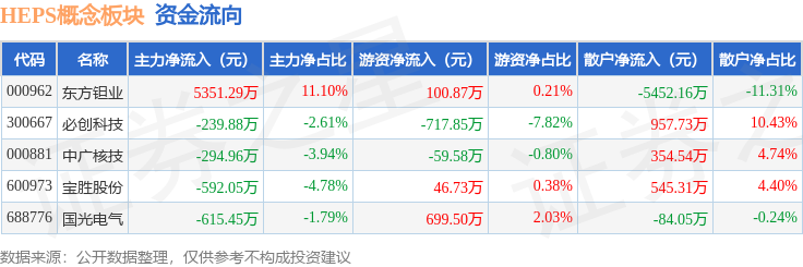 从资金流向上来看,当日HEPS概念板块主力资金净流入3608.96万元,游资资金净流入69.67万元,散户资金净流出3678.63万元。HEPS概念板块个股资金流向见下表: