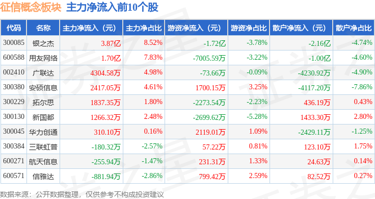 从资金流向上来看,当日征信概念板块主力资金净流入5.75亿元,游资资金净流出2.39亿元,散户资金净流出3.36亿元。征信概念板块个股资金流向见下表: