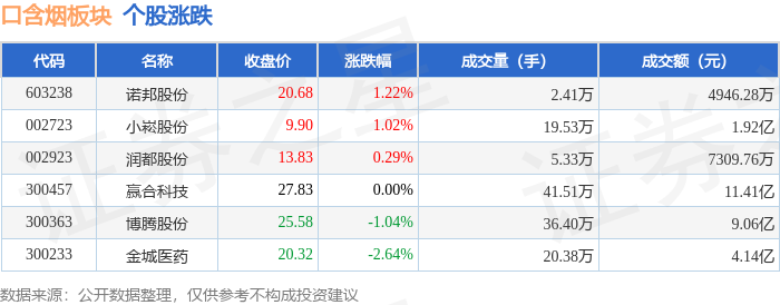 证券之星消息,9月11日口含烟板块较上一交易日下跌0.52%,金城医药领跌。当日上证指数报收于3875.31,上涨1.65%。深证成指报收于12979.89,上涨3.36%。口含烟板块个股涨跌见下表: