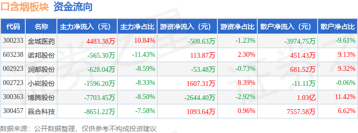 从资金流向上来看,当日口含烟板块主力资金净流出1.47亿元,游资资金净流出391.69万元,散户资金净流入1.51亿元。口含烟板块个股资金流向见下表: