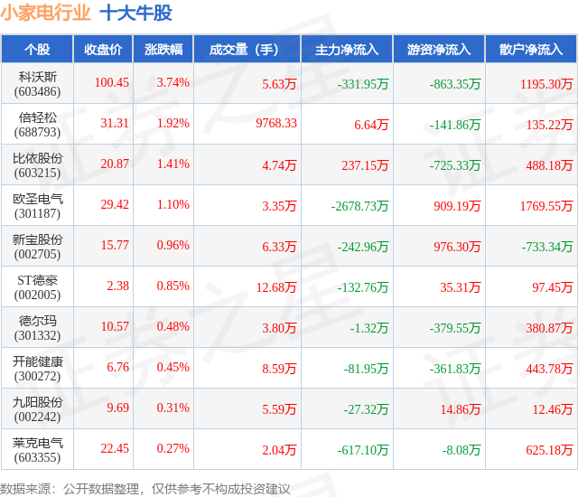 个股表现方面,小家电行业当日领涨股为科沃斯(603486),该股当日报收100.45,上涨3.74%,成交量5.63万,主力资金净流出331.95万元。倍轻松(688793)以上涨1.92%紧随其后,该股当日成交量9768.0,主力资金净流入6.64万元。除此之外,比依股份(603215)、欧圣电气(301187)、新宝股份(002705)均进入当日牛股之列。具体个股列表见下表: