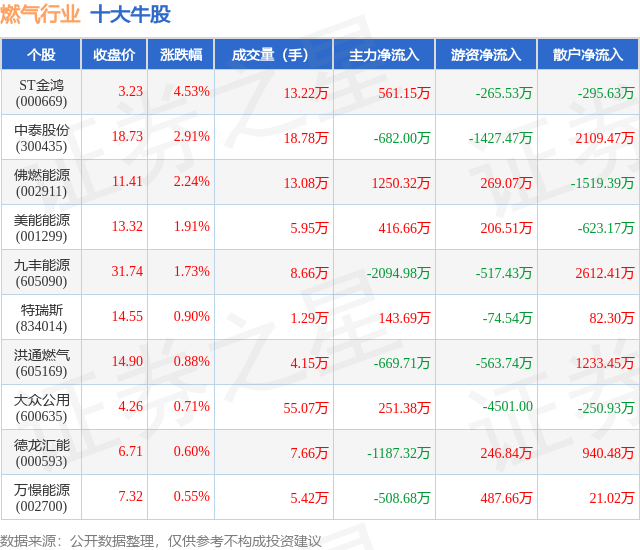 个股表现方面,燃气行业当日领涨股为ST金鸿(000669),该股当日报收3.23,上涨4.53%,成交量13.22万,主力资金净流入561.15万元。中泰股份(300435)以上涨2.91%紧随其后,该股当日成交量18.78万,主力资金净流出682.0万元。除此之外,佛燃能源(002911)、美能能源(001299)、九丰能源(605090)均进入当日牛股之列。具体个股列表见下表: