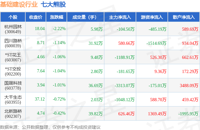 个股表现方面,基础建设行业当日领跌股为杭州园林(300649),该股当日报收18.04,下跌2.22%,成交量5.98万,主力资金净流出104.5万元。四川路桥(600039)以下跌1.14%紧随其后,该股当日成交量31.92万,主力资金净流入580.66万元。除此之外,*ST花王(603007)、*ST交投(002200)、国晟科技(603778)均进入当日熊股之列。具体个股列表见下表: