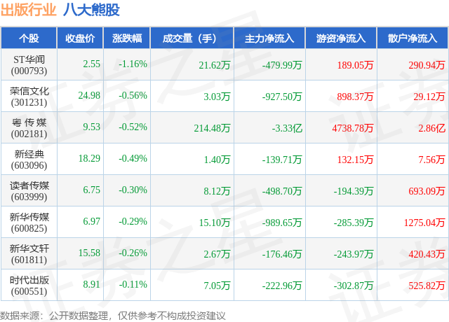 个股表现方面,出版行业当日领跌股为ST华闻(000793),该股当日报收2.55,下跌1.16%,成交量21.62万,主力资金净流出479.99万元。荣信文化(301231)以下跌0.56%紧随其后,该股当日成交量3.03万,主力资金净流出927.5万元。除此之外,粤 传 媒(002181)、新经典(603096)、读者传媒(603999)均进入当日熊股之列。具体个股列表见下表: