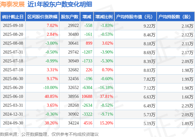 从股价来看,2025年8月20日至2025年9月10日,海泰发展区间涨幅为7.02%,在此期间股东户数减少558.0户,减幅为1.83%。