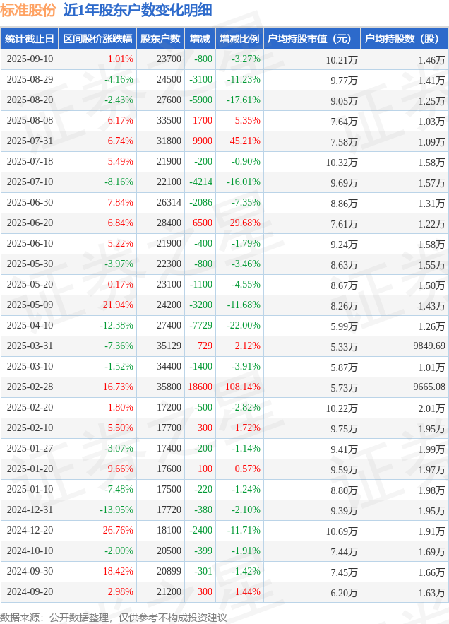 从股价来看,2025年8月29日至2025年9月10日,标准股份区间涨幅为1.01%,在此期间股东户数减少800.0户,减幅为3.27%。