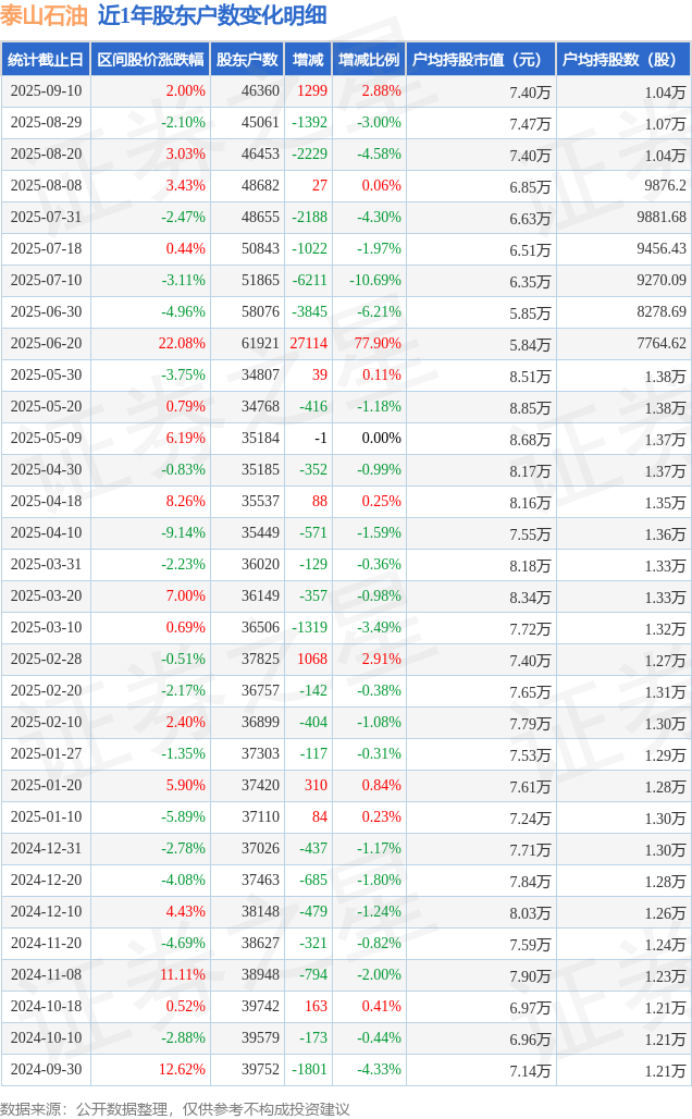 从股价来看,2025年8月29日至2025年9月10日,泰山石油区间涨幅为2.0%,在此期间股东户数增加1299.0户,增幅为2.88%。