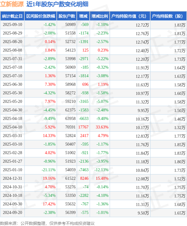 从股价来看,2025年8月29日至2025年9月10日,立新能源区间跌幅为1.42%,在此期间股东户数减少569.0户,减幅为1.1%。