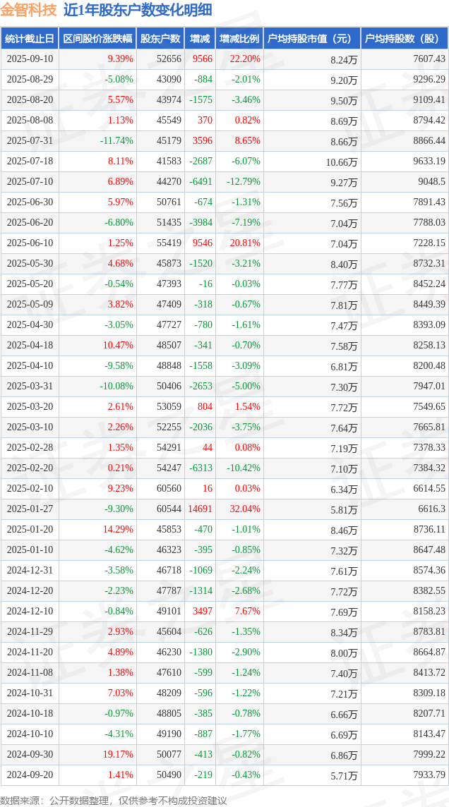 从股价来看,2025年8月29日至2025年9月10日,金智科技区间涨幅为9.39%,在此期间股东户数增加9566.0户,增幅为22.2%。