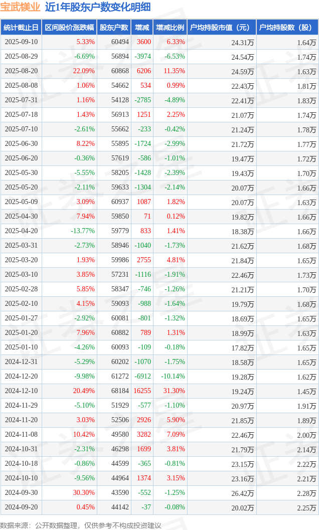 从股价来看,2025年8月29日至2025年9月10日,宝武镁业区间涨幅为5.33%,在此期间股东户数增加3600.0户,增幅为6.33%。