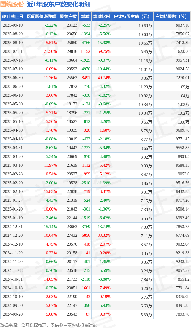 从股价来看,2025年8月29日至2025年9月10日,国统股份区间跌幅为2.22%,在此期间股东户数减少533.0户,减幅为2.25%。
