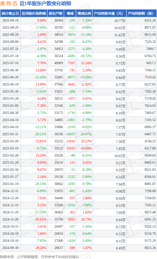 从股价来看,2025年8月29日至2025年9月10日,奥 特 迅区间涨幅为0.08%,在此期间股东户数减少339.0户,减幅为1.1%。