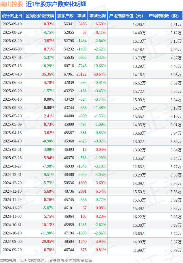 从股价来看,2025年8月29日至2025年9月10日,南山控股区间涨幅为10.32%,在此期间股东户数增加3486.0户,增幅为6.6%。