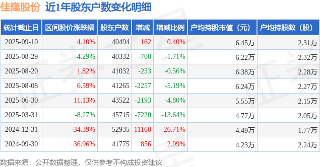 从股价来看,2025年8月29日至2025年9月10日,佳隆股份区间涨幅为4.1%,在此期间股东户数增加162.0户,增幅为0.4%。