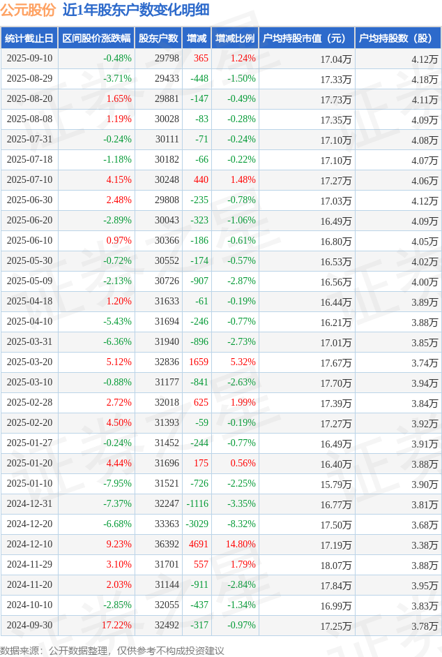 从股价来看,2025年8月29日至2025年9月10日,公元股份区间跌幅为0.48%,在此期间股东户数增加365.0户,增幅为1.24%。