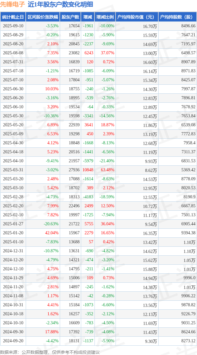 从股价来看,2025年8月29日至2025年9月10日,先锋电子区间跌幅为3.53%,在此期间股东户数减少1961.0户,减幅为10.0%。