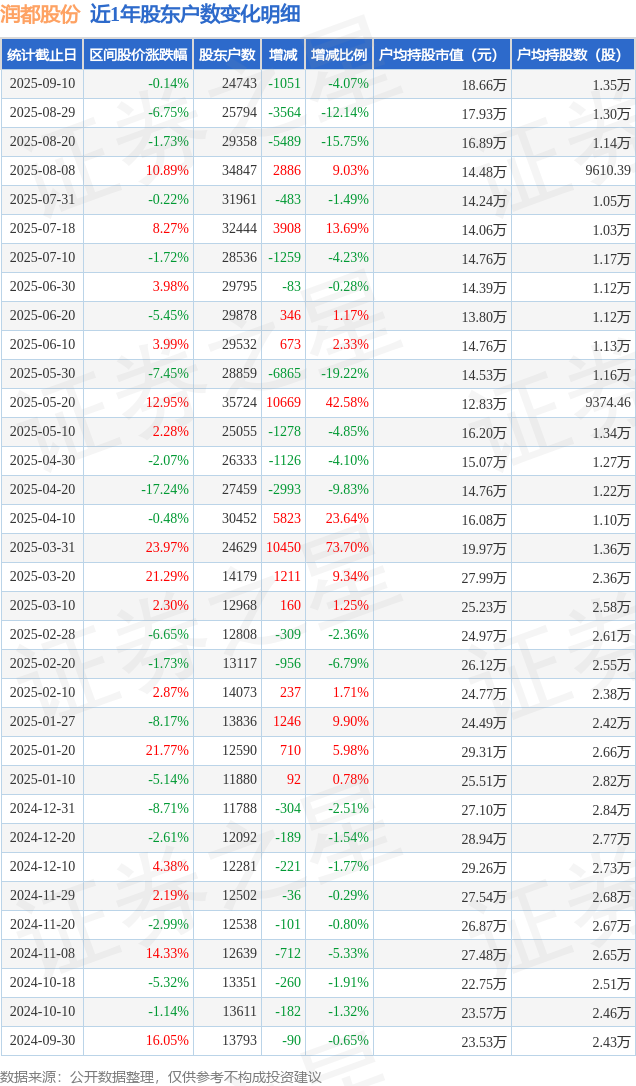 从股价来看,2025年8月29日至2025年9月10日,润都股份区间跌幅为0.14%,在此期间股东户数减少1051.0户,减幅为4.07%。