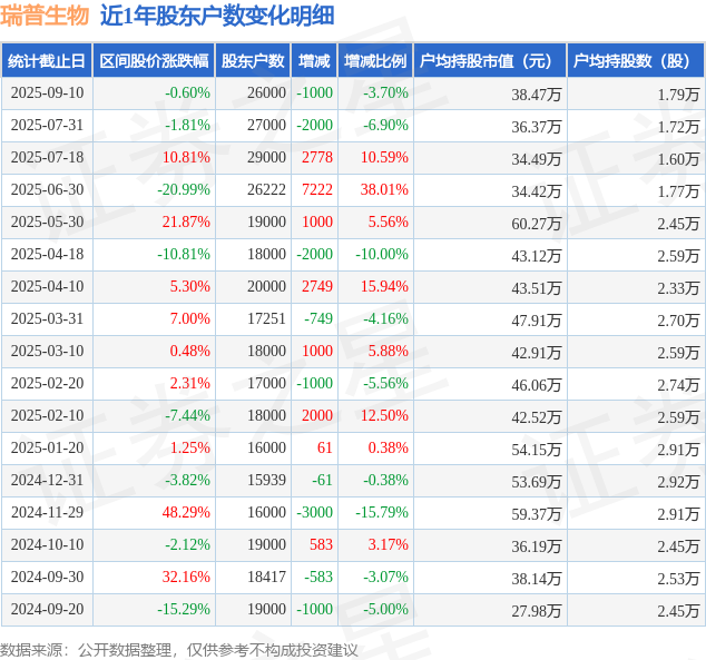 从股价来看,2025年8月8日至2025年9月10日,瑞普生物区间跌幅为0.6%,在此期间股东户数减少1000.0户,减幅为3.7%。