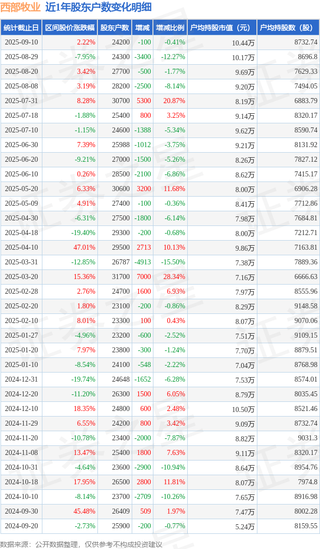 从股价来看,2025年8月29日至2025年9月10日,西部牧业区间涨幅为2.22%,在此期间股东户数减少100.0户,减幅为0.41%。