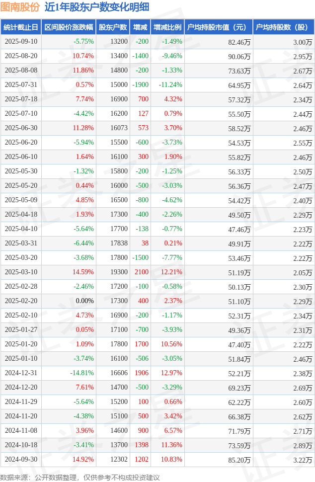 证券之星消息,近日图南股份披露,截至2025年9月10日公司股东户数为1.32万户,较8月29日减少200.0户,减幅为1.49%。户均持股数量由上期的2.95万股增加至3.0万股,户均持股市值为82.46万元。