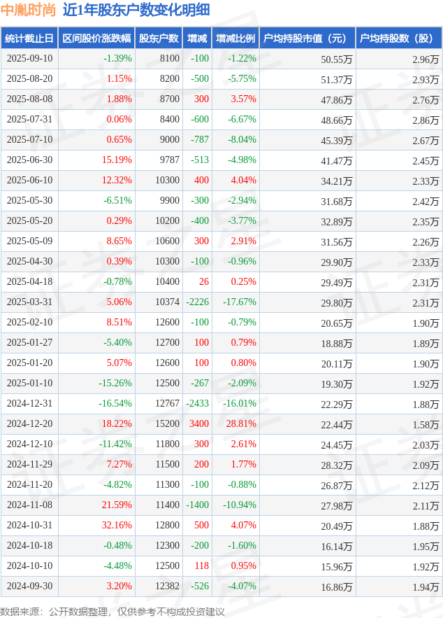 从股价来看,2025年8月29日至2025年9月10日,中胤时尚区间跌幅为1.39%,在此期间股东户数减少100.0户,减幅为1.22%。