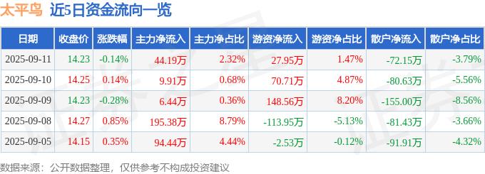 9月11日的资金流向数据方面,主力资金净流入44.19万元,占总成交额2.32%,游资资金净流入27.95万元,占总成交额1.47%,散户资金净流出72.15万元,占总成交额3.79%。