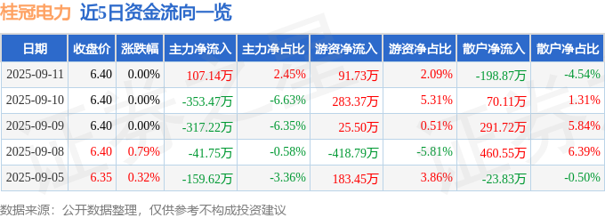 证券之星消息,截至2025年9月11日收盘,桂冠电力(600236)报收于6.4元,上涨0.0%,换手率0.09%,成交量6.86万手,成交额4381.4万元。