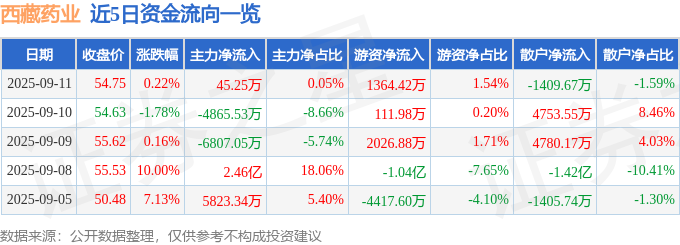 证券之星消息,截至2025年9月11日收盘,西藏药业(600211)报收于54.75元,上涨0.22%,换手率5.07%,成交量16.34万手,成交额8.87亿元。