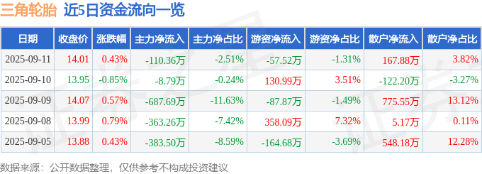 证券之星消息,截至2025年9月11日收盘,三角轮胎(601163)报收于14.01元,上涨0.43%,换手率0.39%,成交量3.15万手,成交额4400.26万元。