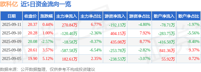 证券之星消息,截至2025年9月11日收盘,欧科亿(688308)报收于20.37元,上涨0.44%,换手率1.25%,成交量1.99万手,成交额4001.66万元。