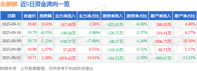 证券之星消息,截至2025年9月11日收盘,金麒麟(603586)报收于19.82元,上涨0.61%,换手率1.7%,成交量3.33万手,成交额6545.17万元。