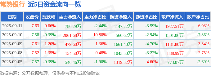 证券之星消息,截至2025年9月11日收盘,常熟银行(601128)报收于7.63元,上涨0.66%,换手率1.27%,成交量42.15万手,成交额3.19亿元。