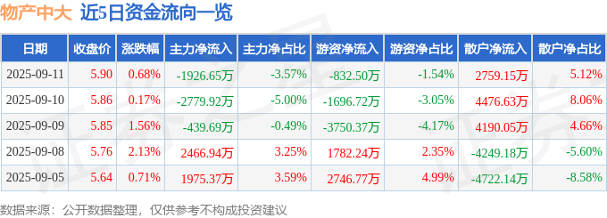 9月11日的资金流向数据方面,主力资金净流出1926.65万元,占总成交额3.57%,游资资金净流出832.5万元,占总成交额1.54%,散户资金净流入2759.15万元,占总成交额5.12%。