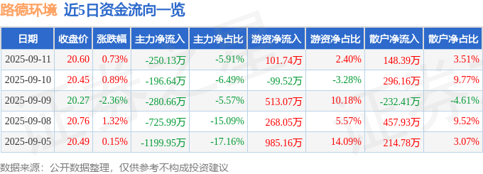 证券之星消息,截至2025年9月11日收盘,路德环境(688156)报收于20.6元,上涨0.73%,换手率2.06%,成交量2.08万手,成交额4230.76万元。