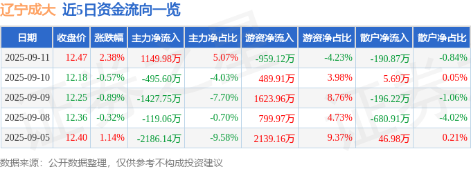 证券之星消息,截至2025年9月11日收盘,辽宁成大(600739)报收于12.47元,上涨2.38%,换手率1.21%,成交量18.46万手,成交额2.27亿元。