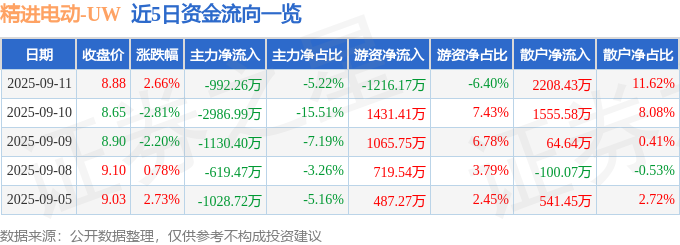 证券之星消息,截至2025年9月11日收盘,精进电动(688280)报收于8.88元,上涨2.66%,换手率4.17%,成交量21.72万手,成交额1.9亿元。