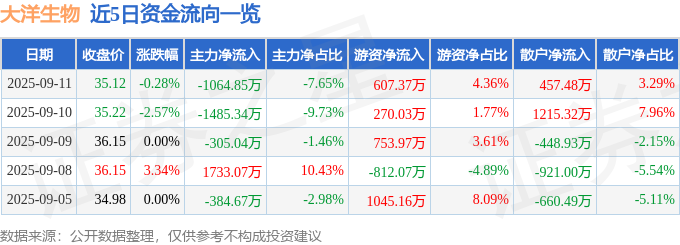 证券之星消息,截至2025年9月11日收盘,大洋生物(003017)报收于35.12元,下跌0.28%,换手率5.77%,成交量4.0万手,成交额1.39亿元。