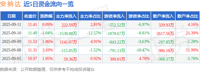 证券之星消息,截至2025年9月11日收盘,安 纳 达(002136)报收于11.41元,上涨0.09%,换手率3.28%,成交量7.03万手,成交额7929.81万元。
