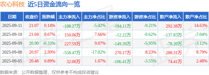 9月11日的资金流向数据方面,主力资金净流出108.27万元,占总成交额5.42%,游资资金净流出184.11万元,占总成交额9.21%,散户资金净流入292.38万元,占总成交额14.63%。