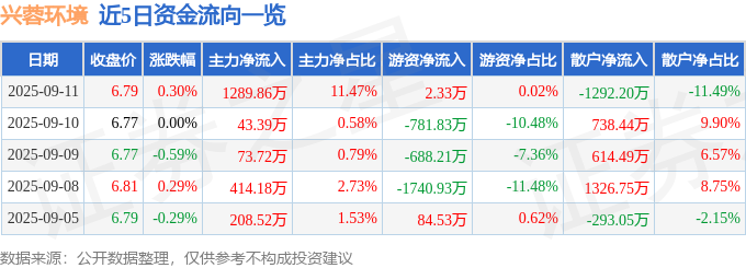 证券之星消息,截至2025年9月11日收盘,兴蓉环境(000598)报收于6.79元,上涨0.3%,换手率0.56%,成交量16.65万手,成交额1.12亿元。