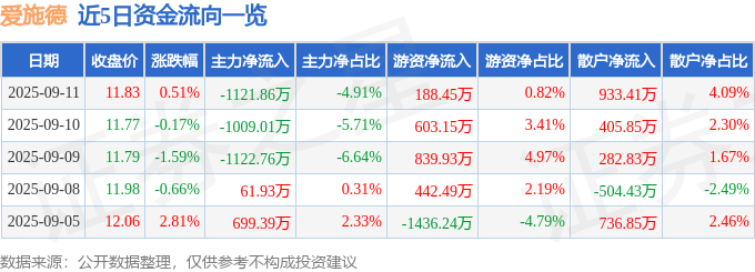 9月11日的资金流向数据方面,主力资金净流出1121.86万元,占总成交额4.91%,游资资金净流入188.45万元,占总成交额0.82%,散户资金净流入933.41万元,占总成交额4.09%。